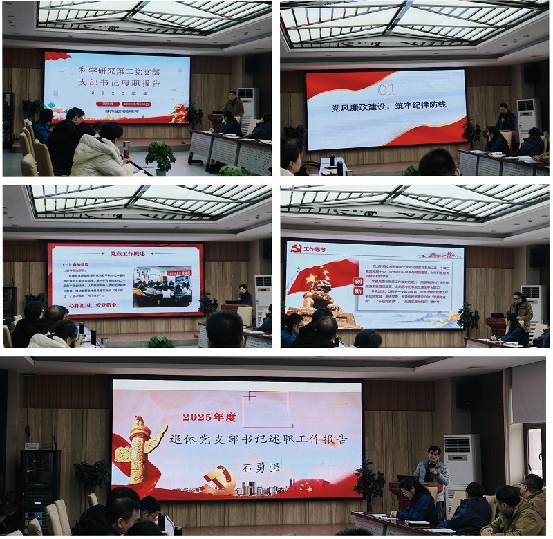 为深入学习贯彻新时代党的建设总要求,全面检验2025年度各党支部书记履职成效,2026年1月30日上午,陕西省动物研究所党委召开2025年度党支部书记述职考评会议。全体党委委员、各党支部书记、在职党支部委员及每个在职党支部3名党员代表参加会议,会议由党委委员、所长常罡主持。?????